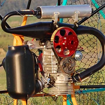 Radne社製Raket120エンジンを搭載したモデル。自動遠心クラッチが標準装備されているのでアイドリング時にプロペラは回りません。エアー抜き付きキャップ付属のガソリンタンク(7リットル)は肉厚でしっかり固定されており安全性も万全です。ハーネスは肩吊タイプで軽量ディスタンスバーが装備され、長時間のクロスカントリーフライトも快適に行えます。 電動スターター仕様も対応可能です。