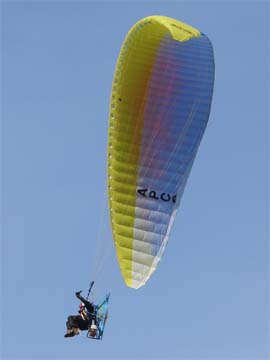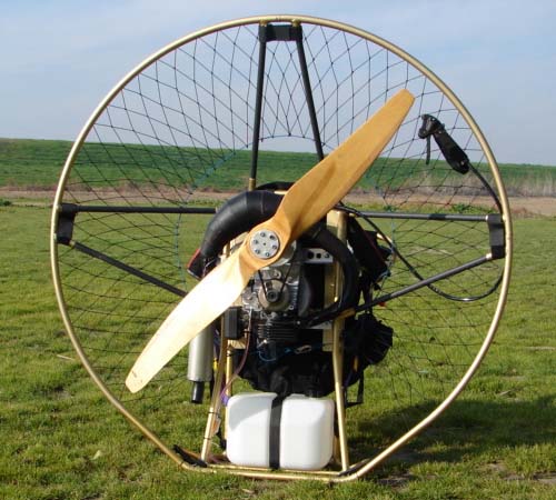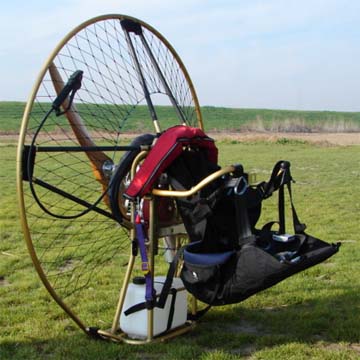 乾燥総重量(レスキューパラシュートは除く)は、プロペラ100cmモデル:15.5kg、115cmモデル:16kg、122cmモデル:16.5kg。アルミ合金製フレームはエンジン部のメインフレームに強度を持たせ、軽量化されたプロペラガードは5分割で収納性が良く、持ち運びが便利です。エンジンは扱い易さと安定した性能で定評のある、Radne社製Raket60を搭載、低燃費と低騒音を兼ね備えています。また、自動遠心クラッチが標準装備されているのでアイドリング時にプロペラは回りません。エアー抜き付きキャップ付属のガソリンタンク(7リットル)は肉厚でしっかり固定されており安全性も万全です。ハーネスは肩吊タイプで軽量ディスタンスバーが装備され、長時間のクロスカントリーフライトも快適に行えます。